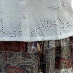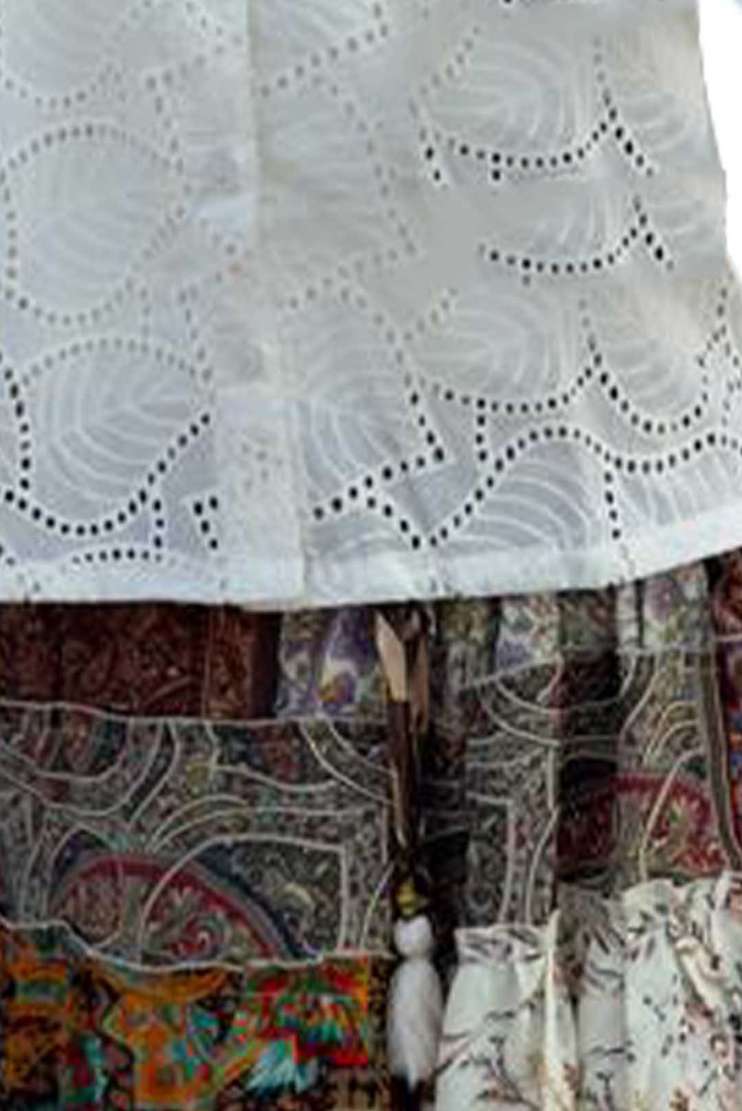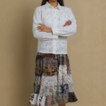 This outfit features a white eyelet embroidered cotton shiffli shirt with front pockets and a collared neckline, paired with a vibrant multi-patterned patchwork midi skirt. The look blends classic elegance with a free-spirited bohemian flair.