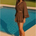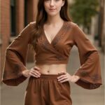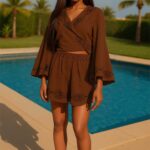 This cozy and stylish cocoa brown co-ord set features a wrap-style crop top with wide bell sleeves and delicate black embroidery, paired with matching embroidered shorts. Ideal for lounging or casual daytime wear.
