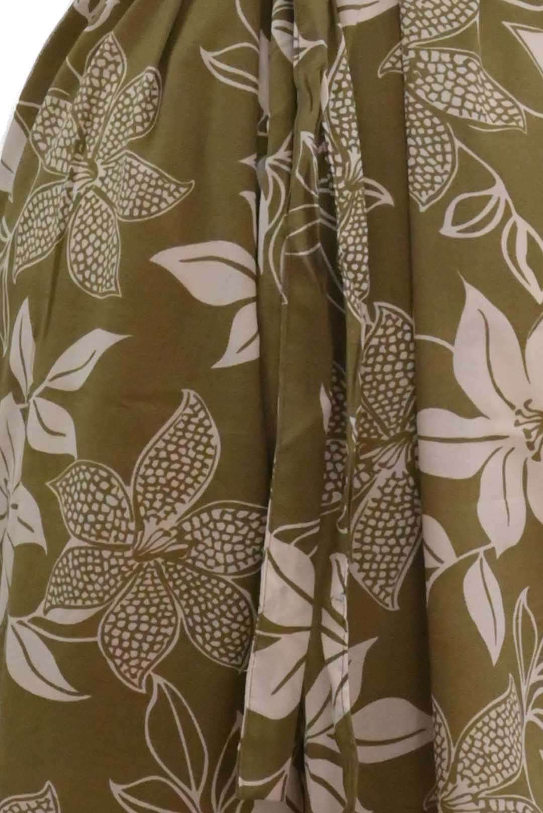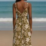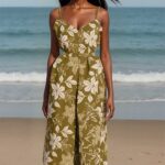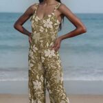 A vibrant green jumpsuit with delicate white floral patterns, featuring a fitted bodice, thin shoulder straps, and flowing wide-leg pants for an elegant, breezy look.
