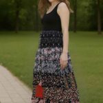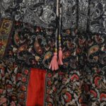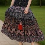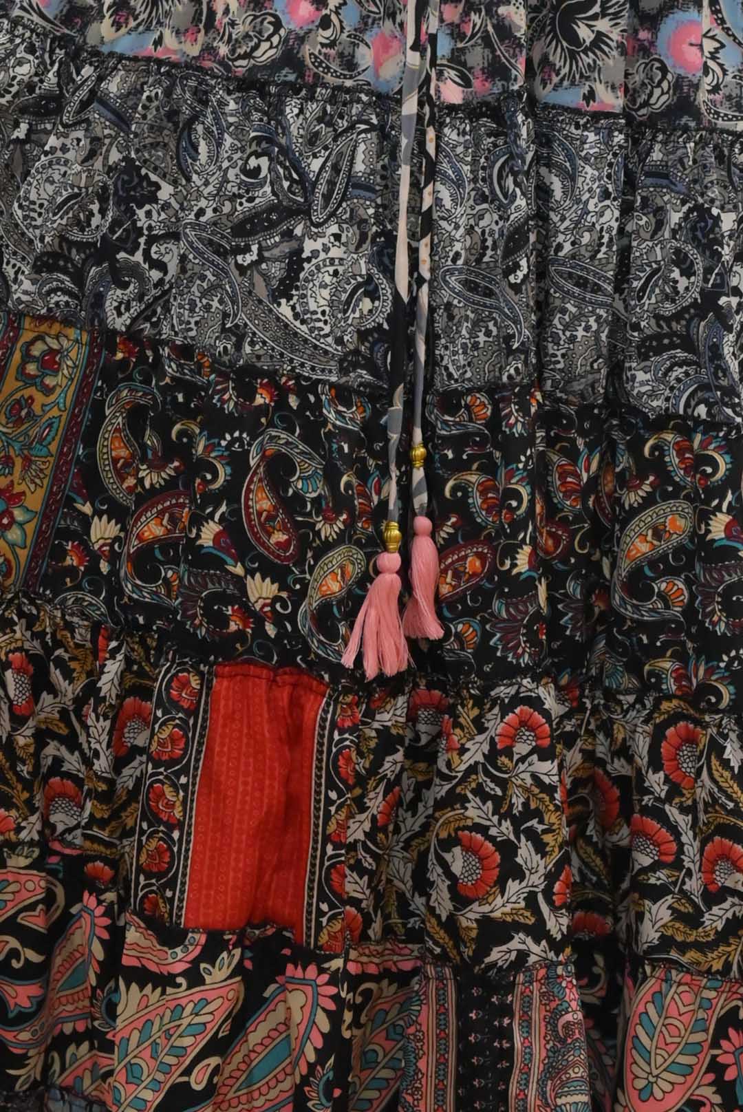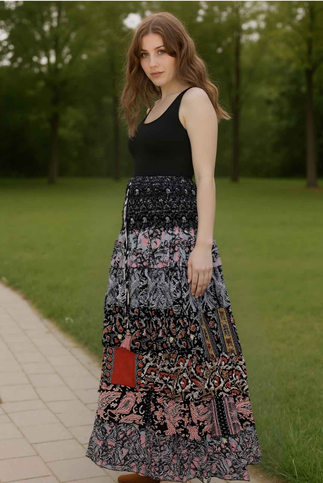 A vibrant ankle-length skirt featuring a mix of intricate ethnic and floral patterns in rich hues of black, red, pink, and green. Designed with a smocked elastic waistband for a comfortable fit and tassel drawstrings for added flair. Ideal for a boho-chic, free-spirited look.