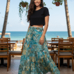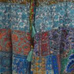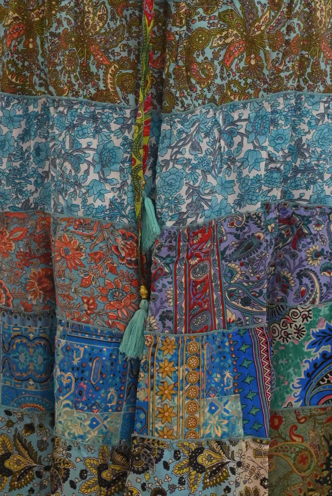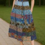 A vibrant, bohemian-style maxi skirt crafted from multicolor patchwork panels with a variety of traditional and floral prints. The flowy fabric and elastic waistband provide a comfortable and free-spirited look, perfect for festivals, beach days, or casual outings.