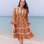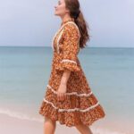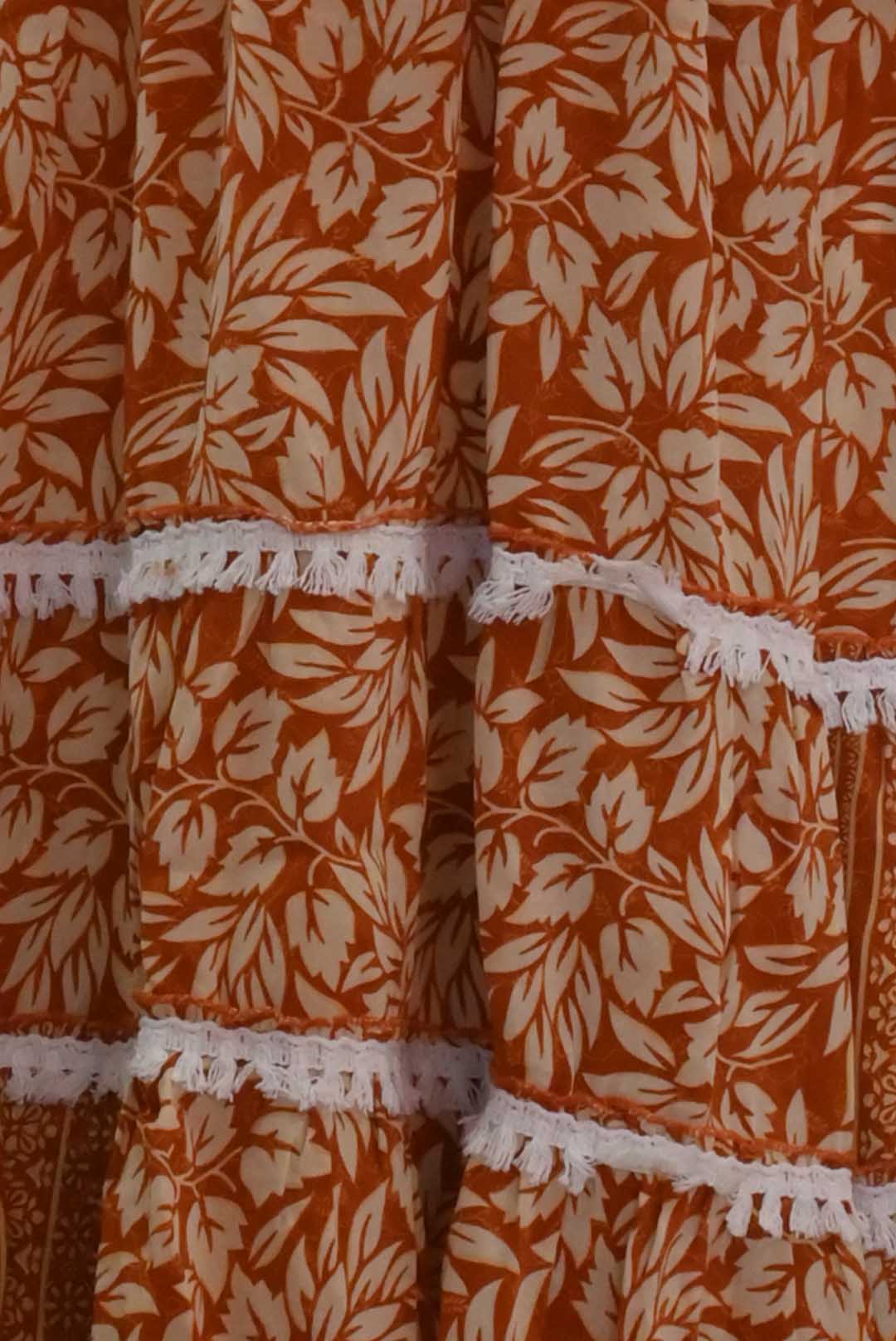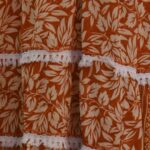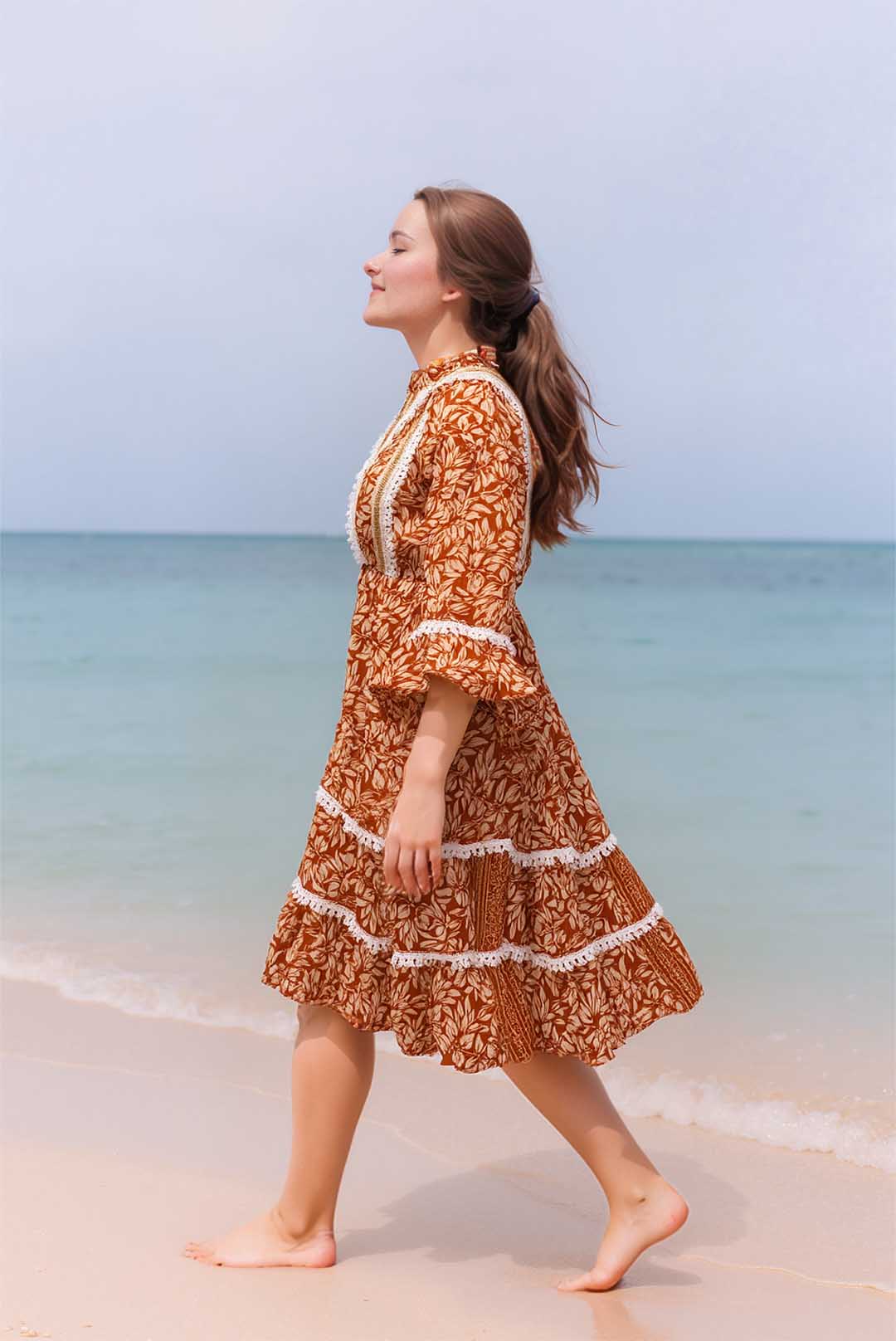 This charming boho-style dress features an earthy rust-orange base with delicate white floral prints, accented by lace detailing and buttoned front placket. The flared hem and bell sleeves give it a relaxed, breezy feel?ideal for casual outings or a rustic day look.