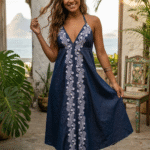 Elevate your everyday style with this sleeveless denim long dress, designed for comfort and elegance. Crafted from soft, breathable denim, it features delicate vertical embroidery that adds a touch of artisanal charm. The flattering V-neckline and flowy silhouette create a relaxed yet feminine look, perfect for sunny days and beachside strolls. Easy to wear and effortlessly stylish, this dress is your go-to for a chic, laid-back vibe.